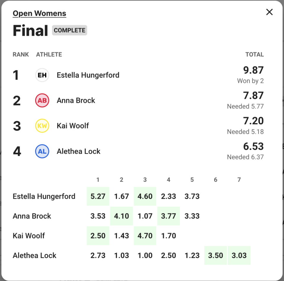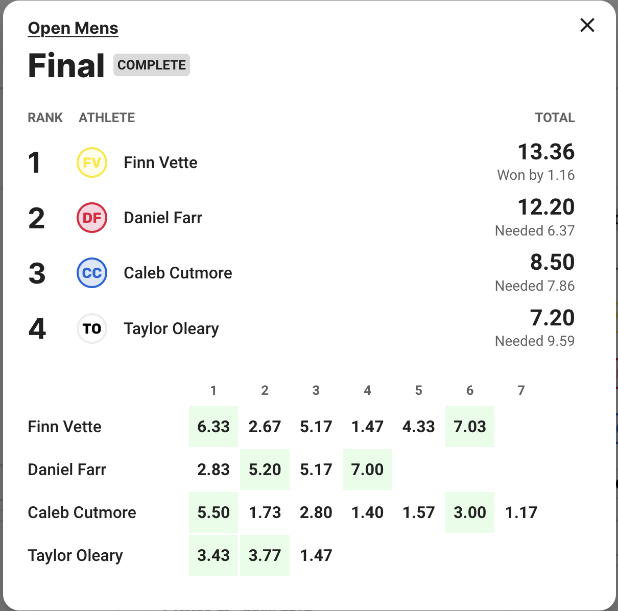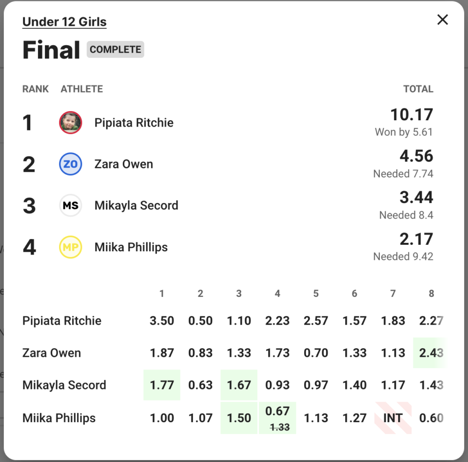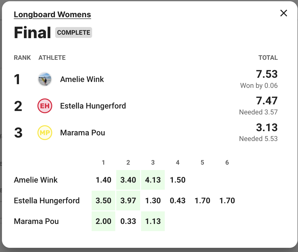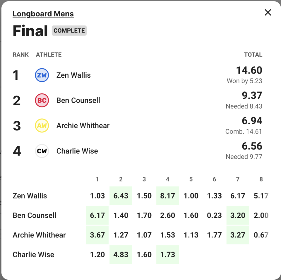 7: Estella Hungerford makes two finals and goes 1-2. The Sumner surfer and step-sister to Ava Henderson not only won the Open Women’s, but she backed it up with a second in the Women’s Longboard – only missing out on the win by a mere 0.06. Her results are proof that hard work really pays off. Watch this athlete.