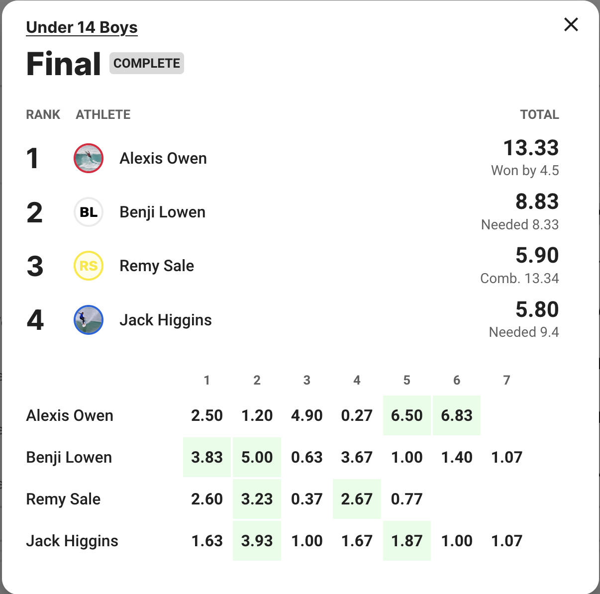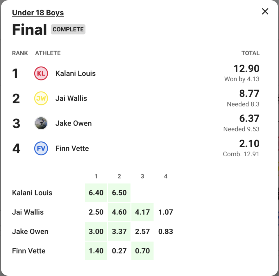 1: Kalani Louis wins his first ever Under 18 event. To be fair, it felt like it was just a matter of time for the charismatic Taranaki surfer. On such a roll right now and great to see him on top of the podium.