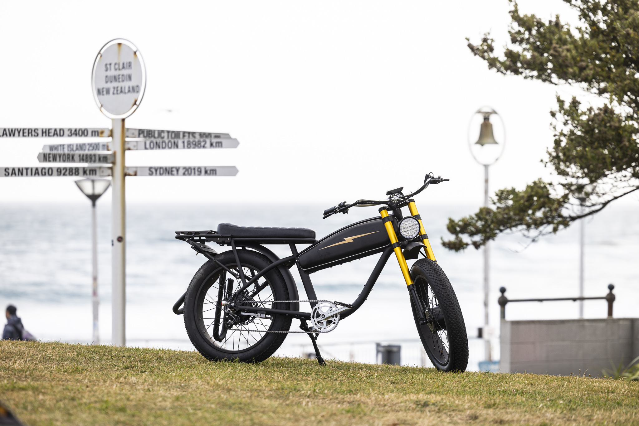 Combined with the swept back cow horn alloy bars and attention to detail with the leather grips, machined pedals, switchblade pillion pegs, headlamp and five-speed Shelby speed controller, this bike attracts attention wherever you go. It’s no surprise to hear musicians and actors are among the early adopters … and the legendary Tom Carroll of course. They’re finding a bike that is perfect for commuting or cruising to check the latest banks, while still maintaining that aura of fascination.