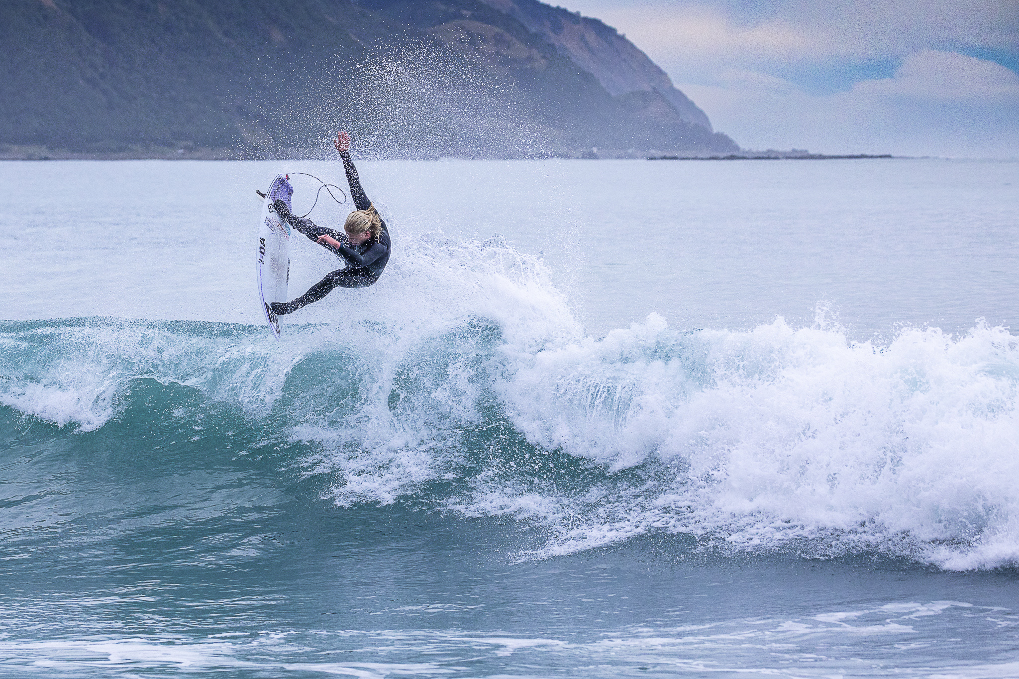 “I find Meatworks to be almost like a peaky fun beachbreak, but with rocks ready to smash your board/body up in the shorebreak,” he smiles. “It’s a very fun wave to compete at with multiple shifting peaks constantly coming in. We have a fun wave at home called Green Meadows and Mangamaunu feels like Green Meadows on steroids. Or perhaps shades of Raglan mirrored? It is so crazy how the highway and railway is next to it, and so scary pulling out of the carpark with big trucks etc flying around the corner. How it is not an 80kmh or less zone baffles me.”
