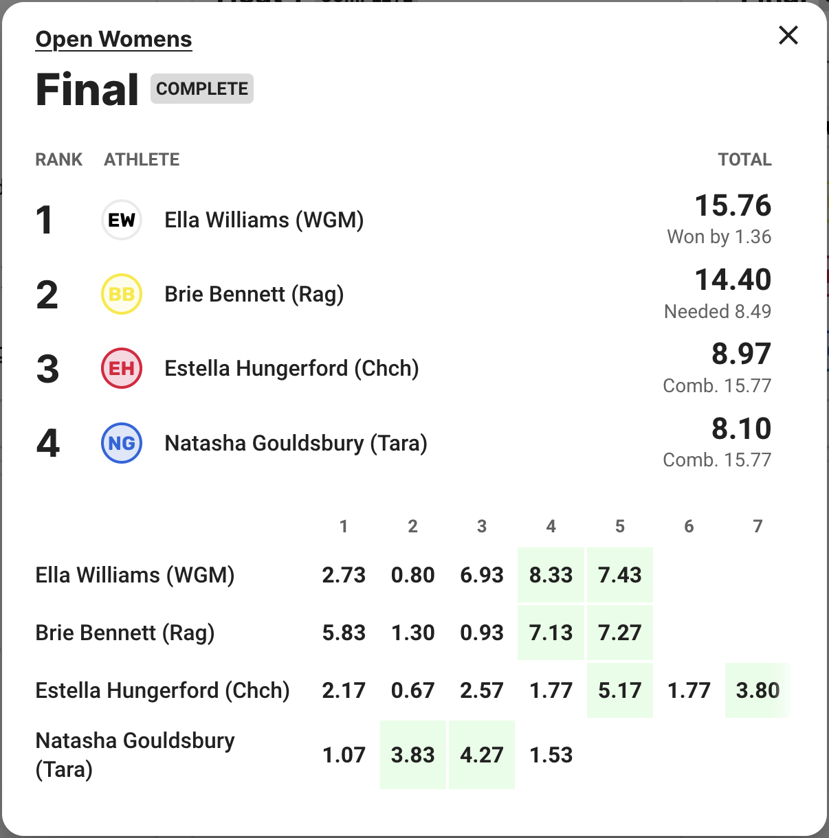 Bennett pushed Williams all the way in the final with Estella Hungerford (Chch) finishing in third and Natasha Gouldsbury (Tara) in fourth.