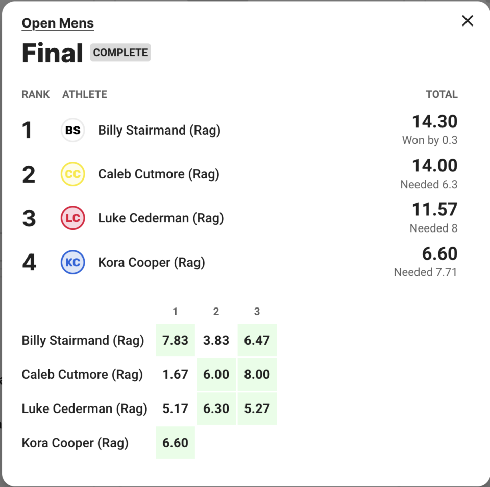 Earlier in the day, Stairmand and Cutmore defeated Jay Quinn (Gis) in the first semifinal while Cederman and Cooper defeated Jarred Hancox (Tara) in the second.