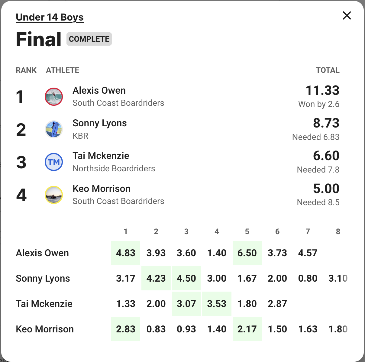 Once again it was Alexis Owen who looked to be in a league of his own in the Under 14s, winning through to a dominant finish in the final to better Sonny Lyons in second, Tai McKenzie in third and Keo Morrison in fourth.