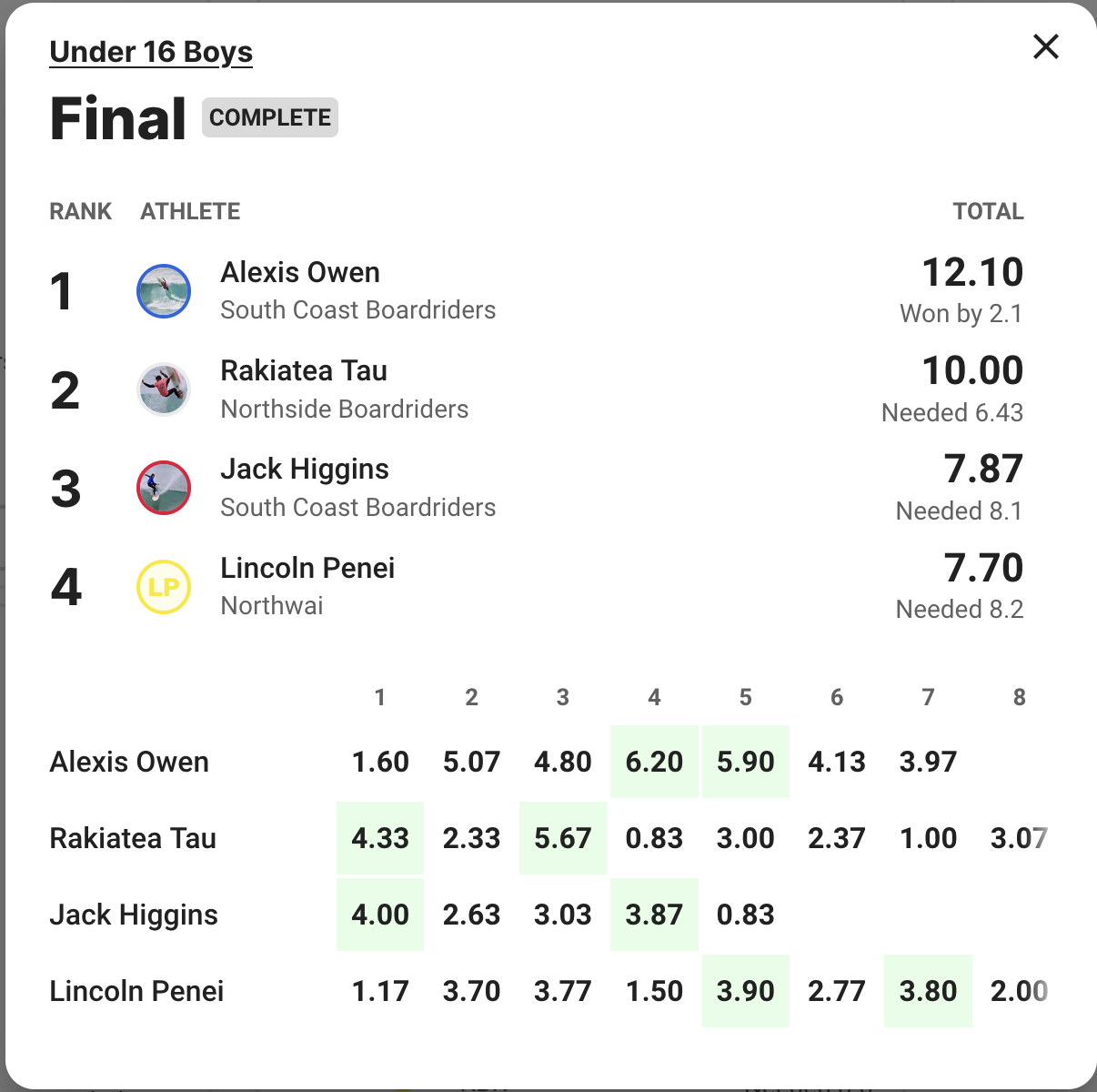 Alexis backed it up again in the Under 16s taking down form surfer in the division Rakiatea Tau to nudge ahead for the win. Third and fourth went to Jack Higgins and Lincoln Penei on this occasion.