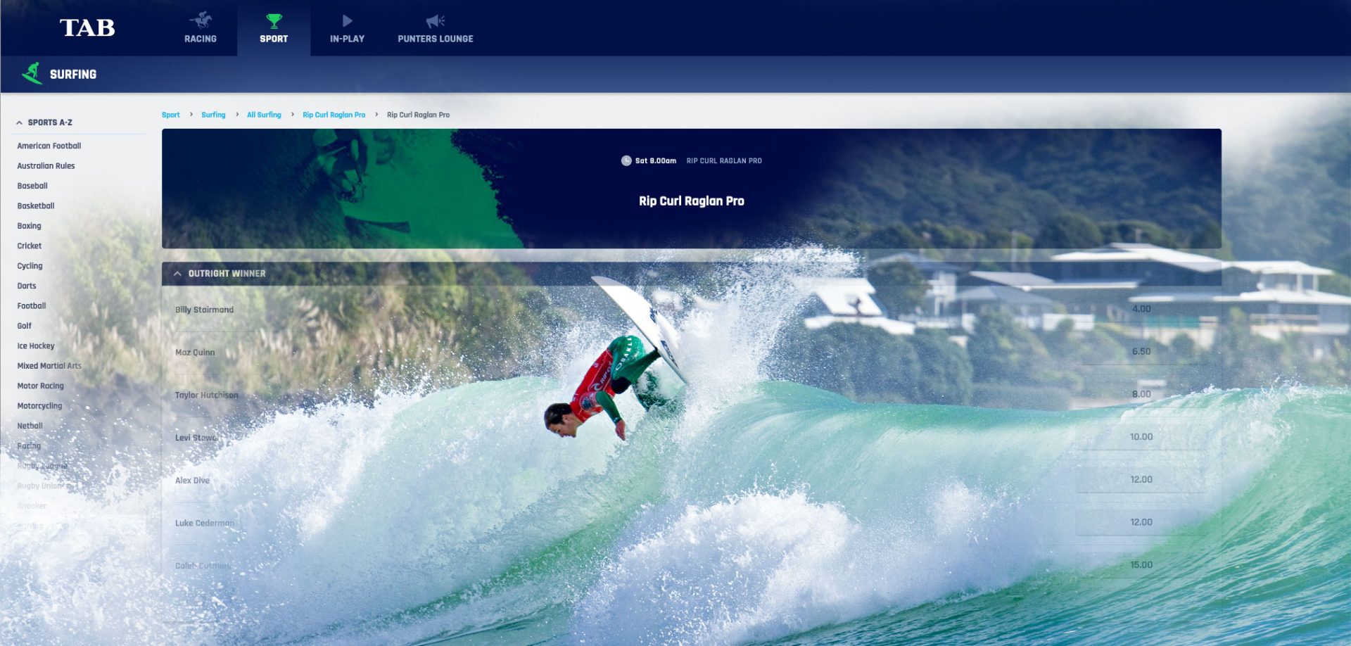 Surfing in New Zealand is about to make history this weekend with Raglan’s Rip Curl Pro featuring at the TAB. Forget your fantasy surf leagues, this is the real thing with real money at stake. Who’s your money on? Billy Stairmand? Dune Kennings? Maz Quinn? Aimee Brown or Ella Williams?