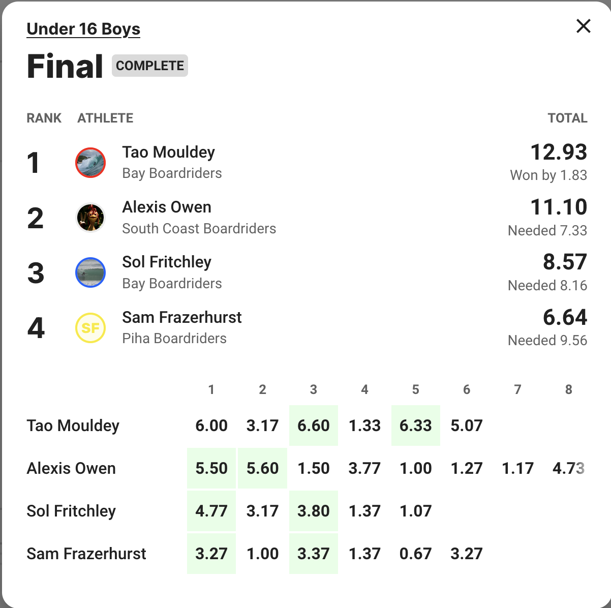 Tao Mouldey, who had taken an early exit in the Under 18s, came out firing to win the Under 16s. In second was Alexis Owen, with double finalist Sol Fritchley in third and Sam Frazerhurst in fourth.