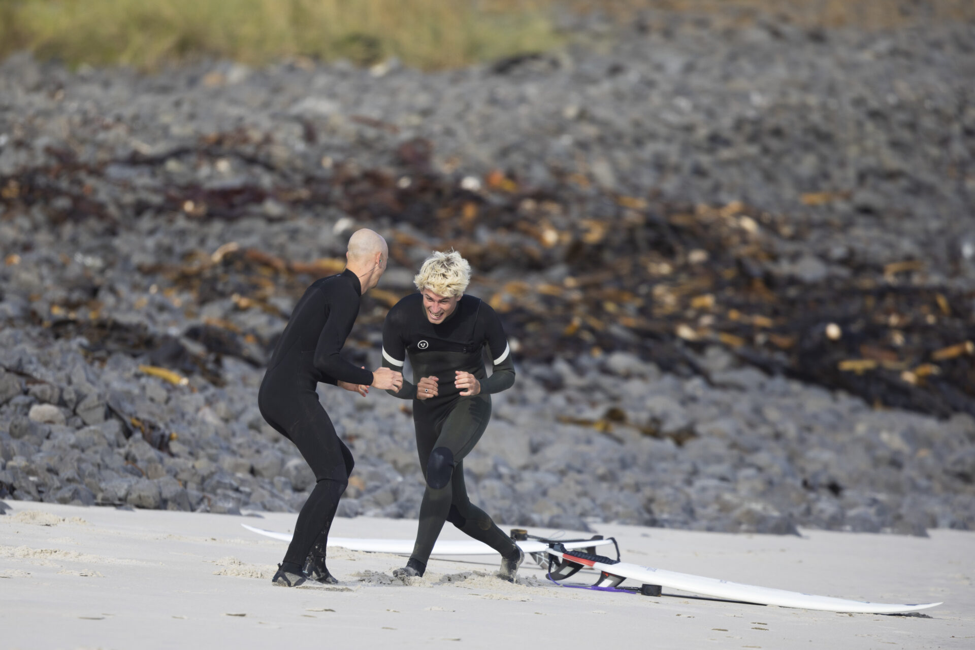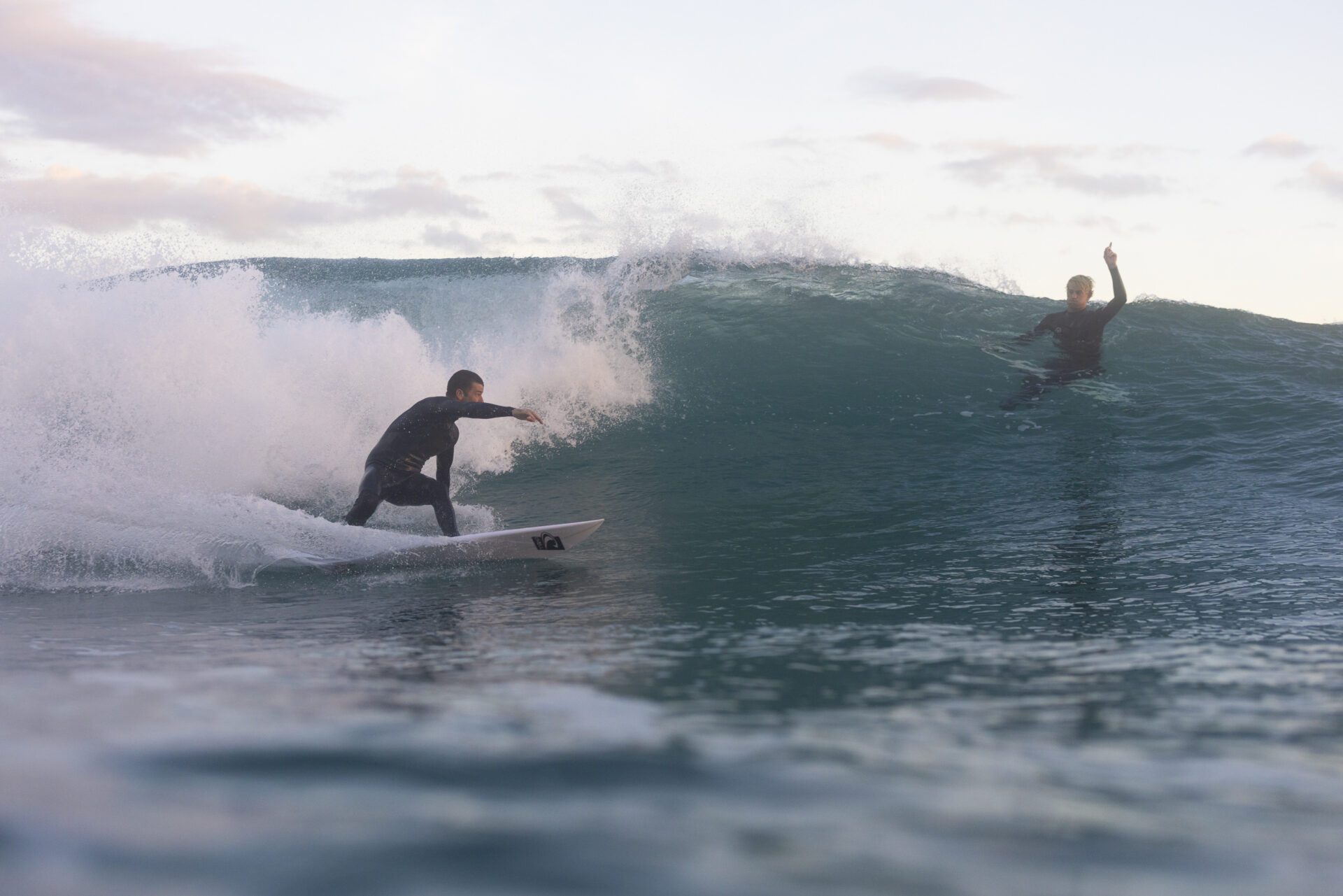 Caleb and Paul are first in the water and paddle straight to the outside take-off. Darren, Daniel and Taylor soon join them. They have the lineup almost completely to themselves, apart from local surfer Ruben Peyroux who is enjoying the chance to ride the walls and show them the way.