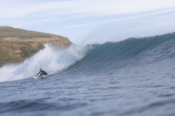 This particular Catlins point break is rarely surfed. Some reckon that’s because of the sharkiness of the place, others reckon it’s a rubbish wave. The outside section is a fast-wally speedrun that delivers you into a kelpy section (the take-off on smaller days) and then into a series of bowls before the wave reels off into the depths of the bay. That only happens on the very big days, but on the day we snagged … it isn’t far off, just the last section pinching shut before the abyss.
