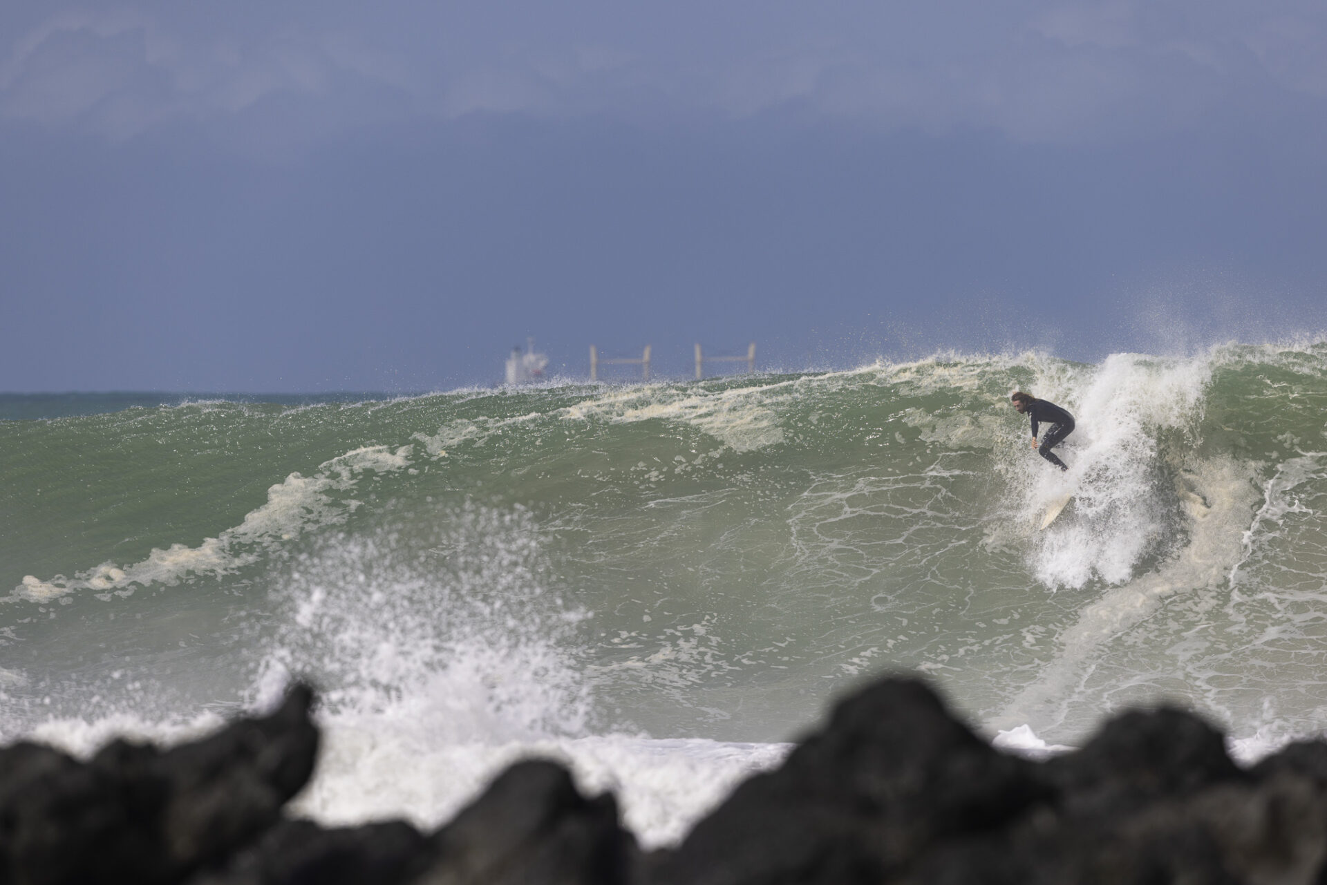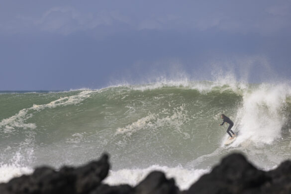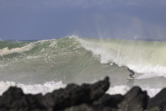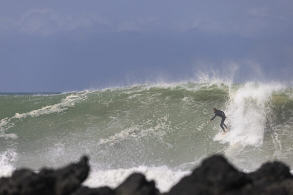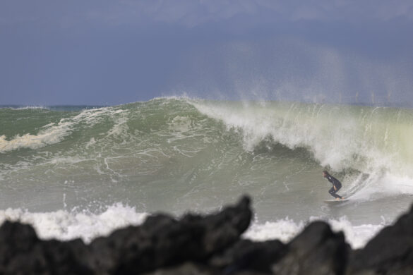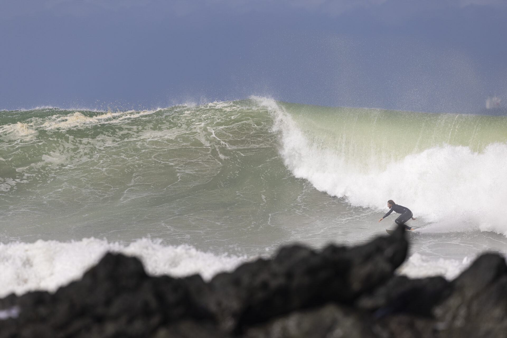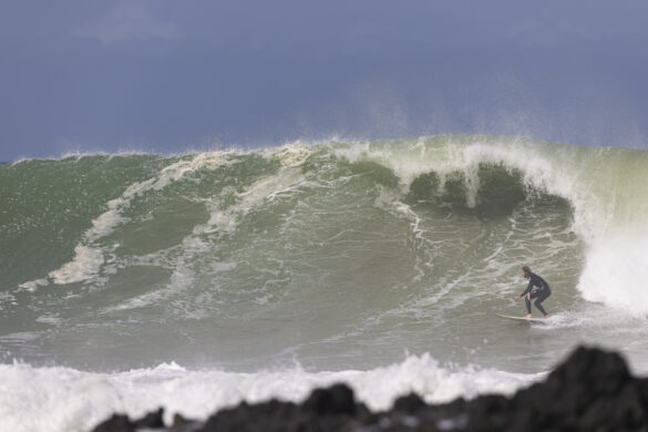 Just as that thought went through my mind Will Fraser turned up (he often appears on the big days and paddles into some of the best waves). Sure enough he stroked into one of the bigger sets and the tow teams let him have it. He got swept up the face as he paddled hard down it – I thought he was a goner. But no, cool as can be, he popped to his feet and free-fell a very long way without even once questioning the ability for his tippy toes to bring the drop under control. He compressed and set his rail and whipped around an impossible section to ride the wave to the end. It was the best wave I had witnessed being ridden all day.