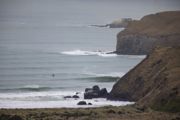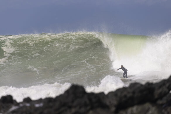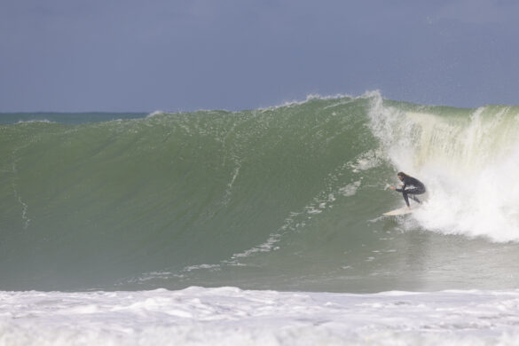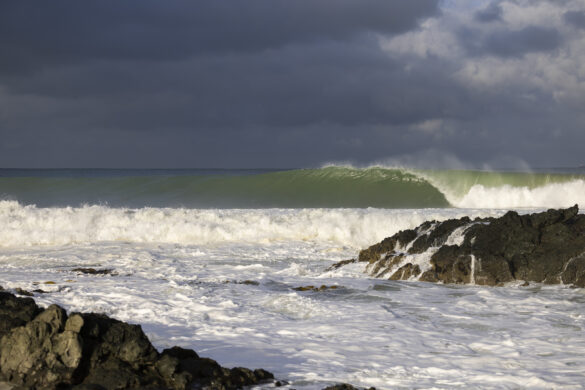 Eventually just Richard O’Keefe and James Streetley remained in the lineup. They traded barrels and found a couple of impressive rides when another paddler arrived from the beach around the corner. Two others had tired to paddle out through the keyhole on the west side only to be washed in way down the beach.