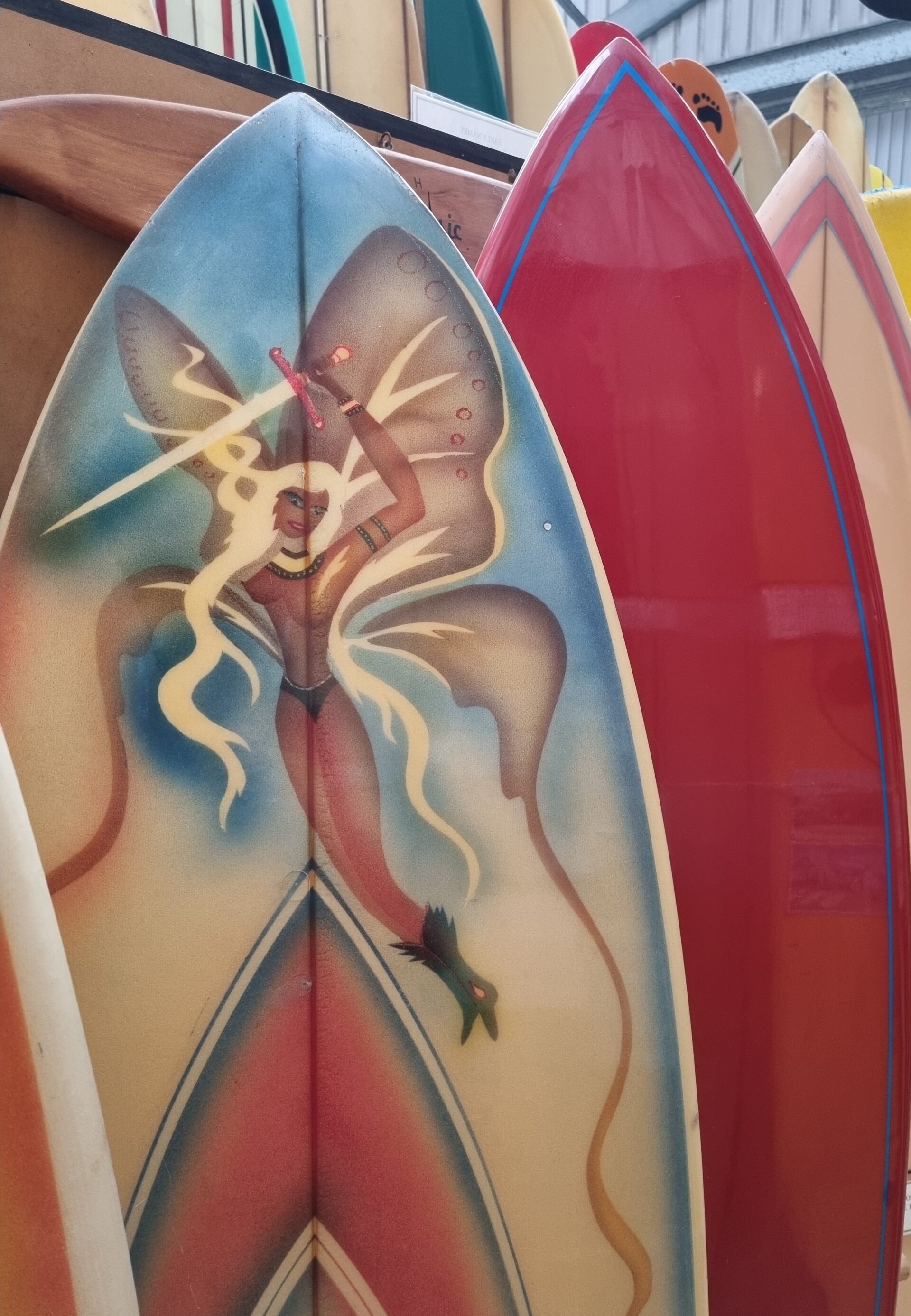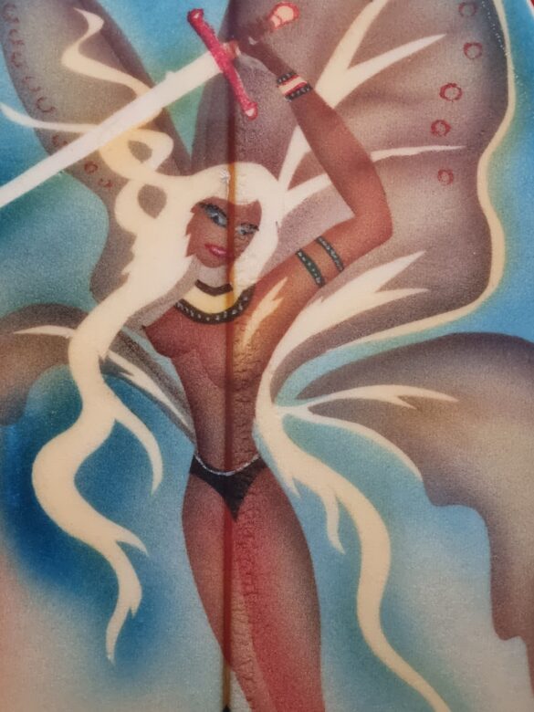 Other surfboards in the collection are collectable as “pop art,” with one-off airbrush designs.